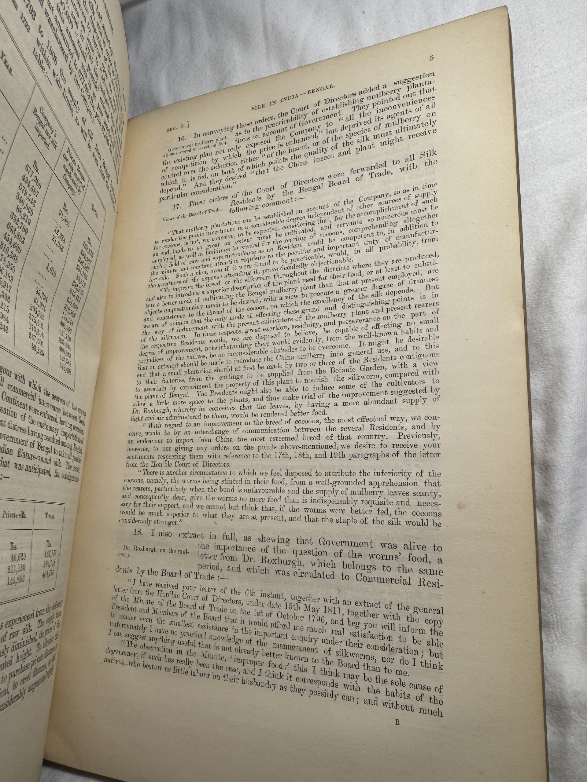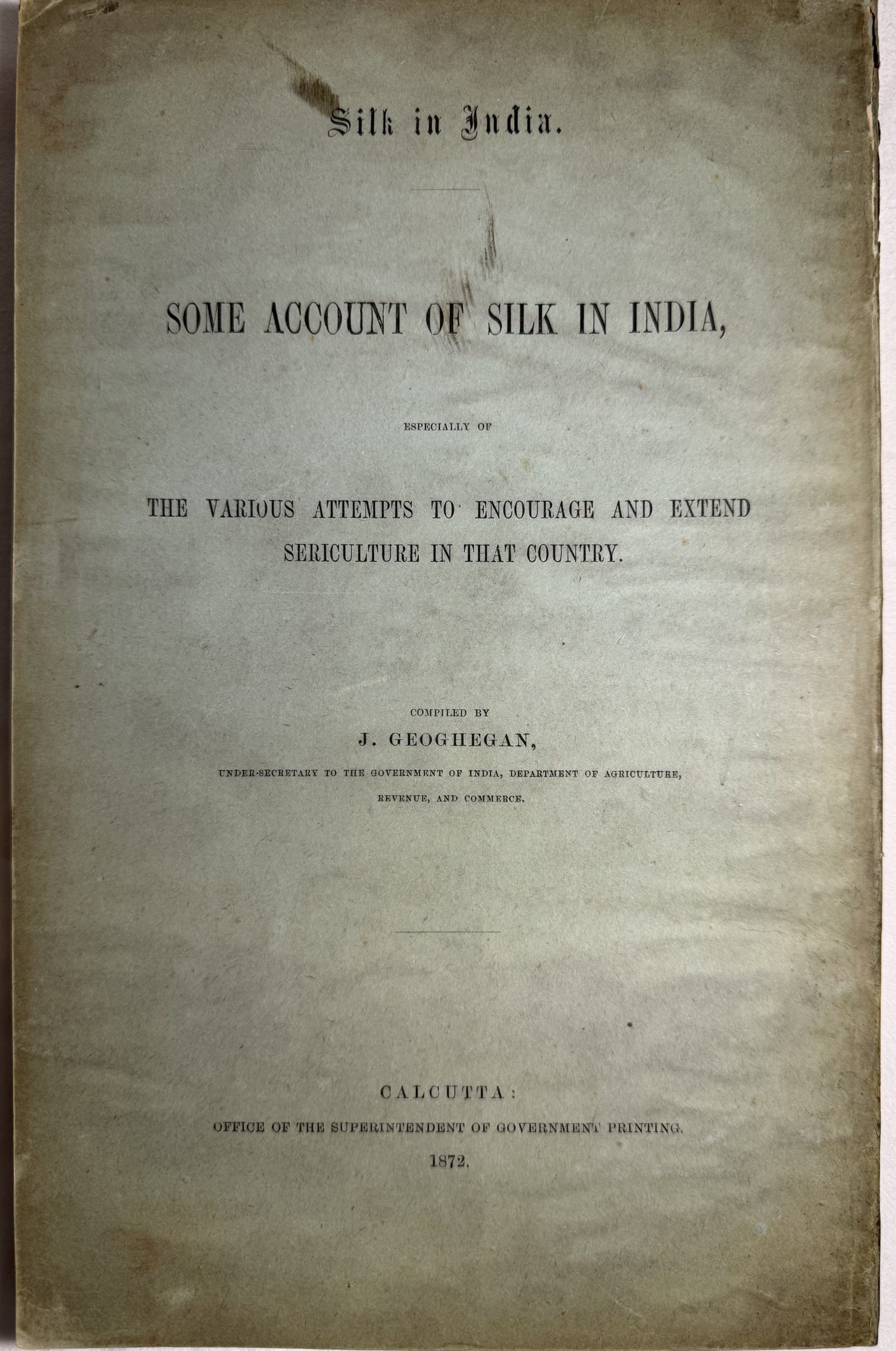 An extremely rare and comprehensive account of the diverse regional silk production hubs in contemporary British India. The publication chronicles comprehensive efforts to improve production and quality of raw silk, particularly the East India Company’s attempts to introduce mechanized silk filatures in Bengal to compete with European markets. The East India Company struggled to modernize production, as Indian artisans were often reluctant to adopt new, mechanized filature technologies and emphasized traditional, handicraft-based procedures for silk weaving. The work highlights the evolution of Indian sericulture and the challenges of industrializing traditional production methods in the 18th and 19th centuries and is considered a true testament of Indian silk and textile production in British India.